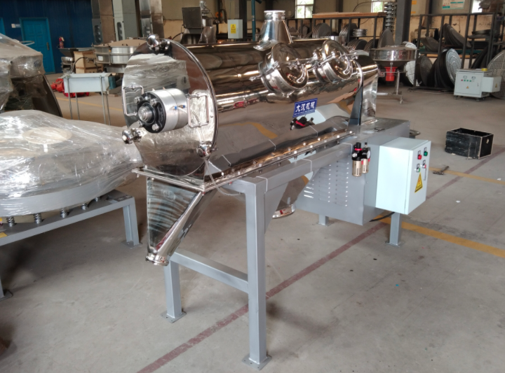 臥式氣流篩也叫氣旋篩,置于機體內(nèi),物料通過螺旋輸送系統(tǒng)后,和氣流混合、霧化進入網(wǎng)筒內(nèi);通過網(wǎng)筒內(nèi)風(fēng)輪葉片使物料同時受離心力和旋風(fēng)推進力,從而近使物料噴射過網(wǎng),由細料排出口排出,不能過網(wǎng)的物料沿網(wǎng)筒壁從粗料排出口排出。